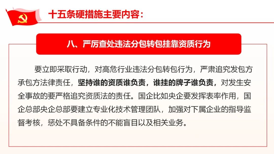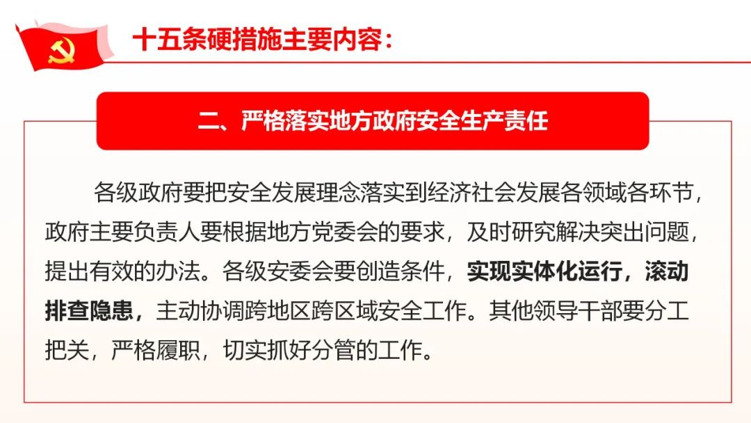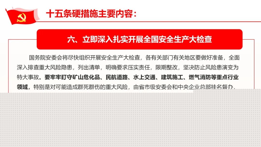 要緊緊圍繞貫徹落實習(xí)近平總書記關(guān)于安全生產(chǎn)重要指示精神和黨中央、國務(wù)院決策部署。推動貫徹執(zhí)行國務(wù)院安委會關(guān)于加強(qiáng)安全生產(chǎn)工作的十五條硬措施。重點檢查以下內(nèi)容∶ (一)地方黨委安全生產(chǎn)責(zé)任落實情況。地方各級黨委是否自覺承擔(dān)起"促一方發(fā)展、保一方平安"的政治責(zé)任,是否按照《地方黨政領(lǐng)導(dǎo)干部安全生產(chǎn)責(zé)任制規(guī)定》嚴(yán)格落實"黨政同責(zé)、一崗雙責(zé)、齊抓共管、失職追責(zé)"要求。黨委主要負(fù)責(zé)人是否主持黨委常委會會議分析安全生產(chǎn)形勢、研究安全生產(chǎn)重大問題,切實加強(qiáng)安全生產(chǎn)工作的組織領(lǐng)導(dǎo)等。 (二)地方政府安全生產(chǎn)責(zé)任落實情況。各級政府是否把安全發(fā)展理念落實到經(jīng)濟(jì)社會發(fā)展各領(lǐng)域、各環(huán)節(jié),主要負(fù)責(zé)人是否根據(jù)地方黨委會議的要求及時研究解決安全生產(chǎn)突出問題并主動協(xié)調(diào)跨地區(qū)、跨區(qū)域安全生產(chǎn)工作,其他領(lǐng)導(dǎo)干部是否切實抓好分管行業(yè)領(lǐng)域安全生產(chǎn)工作、安委辦運行情況等。 (三)部門安全監(jiān)管責(zé)任落實情況。各有關(guān)部門是否按照"管行業(yè)必須管安全、管業(yè)務(wù)必須管安全、管生產(chǎn)經(jīng)營必須管安全"和"誰主管、誰負(fù)責(zé)"的原則依法依規(guī)提出并落實安全責(zé)任清單,是否按照"誰主管誰牽頭、誰為主誰牽頭、誰靠近誰牽頭"的原則及時明確職能交叉以及新業(yè)態(tài)風(fēng)險的安全監(jiān)管責(zé)任。是否推動危化品、燃?xì)?、道路運輸、電動自行車等有關(guān)部門抓實全鏈條安全監(jiān)管,是否對關(guān)系安全生產(chǎn)但是已經(jīng)下放的事項開展評估等。 (四)領(lǐng)導(dǎo)責(zé)任和監(jiān)管責(zé)任追究情況。各地區(qū)是否追究較大以上生產(chǎn)安全事故中不履行職責(zé)的黨委政府領(lǐng)導(dǎo)責(zé)任、有關(guān)部門監(jiān)管責(zé)任,發(fā)生重特大生產(chǎn)安全事故的是否追究主要領(lǐng)導(dǎo)責(zé)任,對嚴(yán)重違法違規(guī)行為沒有采取有效措施甚至放任不管、構(gòu)成犯罪的是否移交司法機(jī)關(guān)追究刑事責(zé)任等。 (五)企業(yè)主要負(fù)責(zé)人履行第一責(zé)任人責(zé)任的情況。企業(yè)法定代表人、實際控制人、實際負(fù)責(zé)人是否嚴(yán)格履行安全生產(chǎn)第一責(zé)任人的法定責(zé)任,是否嚴(yán)格落實重大危險源安全包保責(zé)任制、礦長帶班下井等制度,是否搞"掛名礦長"等弄虛作假手段逃避責(zé)任,對重特大事故負(fù)有責(zé)任的是否落實行業(yè)禁入相關(guān)規(guī)定等。 (六)開展安全風(fēng)險隱患排查整治情況。各地區(qū)、各有關(guān)部門和單位是否列出重大安全風(fēng)險隱患清單并明確要求、壓實責(zé)任、限期整改,是否嚴(yán)厲查處人員密集場所封閉安全出口、封閉疏散通道等違法行為,是否由省、市級安委會或中央企業(yè)總部掛牌督辦重大隱患,對拒不整改的是否停產(chǎn)停工、追究刑責(zé)。對基層難以解決的問題是否及時報告等。 (七)項目審批安全紅線把守情況。各有關(guān)部門是否建立完善安全風(fēng)險評估論證機(jī)制。是否存在"邊審批、邊設(shè)計、邊施工"情況,是否擅自降低?;?、礦山、煙花爆竹、建筑施工、冶金等行業(yè)高危項目、人員聚集場所安全門檻,是否對東部沿海地區(qū)向中西部地區(qū)轉(zhuǎn)移的部分傳統(tǒng)行業(yè)嚴(yán)格安全監(jiān)管等。 (八)違法分包轉(zhuǎn)包、掛靠資質(zhì)行為查處情況。各有關(guān)部門是否嚴(yán)厲查處高危行業(yè)違法分包轉(zhuǎn)包行為。是否嚴(yán)肅追究發(fā)包方、承包方法律責(zé)任,是否嚴(yán)格追究生產(chǎn)安全事故中資質(zhì)方責(zé)任,央企國企總部是否建立專業(yè)化技術(shù)管理團(tuán)隊加強(qiáng)對下屬企業(yè)的指導(dǎo)、監(jiān)督、考核、懲處等。 (九)勞務(wù)派遣和靈活用工人員安全管理情況。生產(chǎn)經(jīng)營單位是否將接受其作業(yè)指令的勞務(wù)派遣人員、靈活用工人員納入本單位統(tǒng)一管理,危險崗位是否嚴(yán)控勞務(wù)派遣員工數(shù)量,有關(guān)部門是否對相關(guān)情況較突出的行業(yè)領(lǐng)域部署開展重點執(zhí)法檢查。央企國企在有關(guān)人員管理上是否發(fā)揮示范帶頭作用等。 (十)"打非治違"工作開展情況。各地區(qū)、各有關(guān)部門是否組織開展"打非治違"專項活動,是否采取精準(zhǔn)措施嚴(yán)厲打擊礦山違法盜采、油氣管道亂挖亂鉆、客車客船漁船和?;贩欠ㄟ\營等各種典型非法違法行為。是否依法依規(guī)從重懲處頂風(fēng)作案、屢禁不改以及監(jiān)管不到位等問題,是否加大曝光警示力度,是否堅決打擊違法行為背后的"保護(hù)傘"、加大"貓鼠一家"腐敗行為查處力度等。 (十一)執(zhí)法檢查寬松軟整治情況。安全生產(chǎn)監(jiān)管執(zhí)法是否存在選擇性執(zhí)法以及寬松軟、走過場等問題。是否確定省市縣三級執(zhí)法管轄企業(yè)名單并明確重點檢查企業(yè)。是否針對事故暴露問題舉一反三加強(qiáng)執(zhí)法檢查,是否組織專家參與執(zhí)法